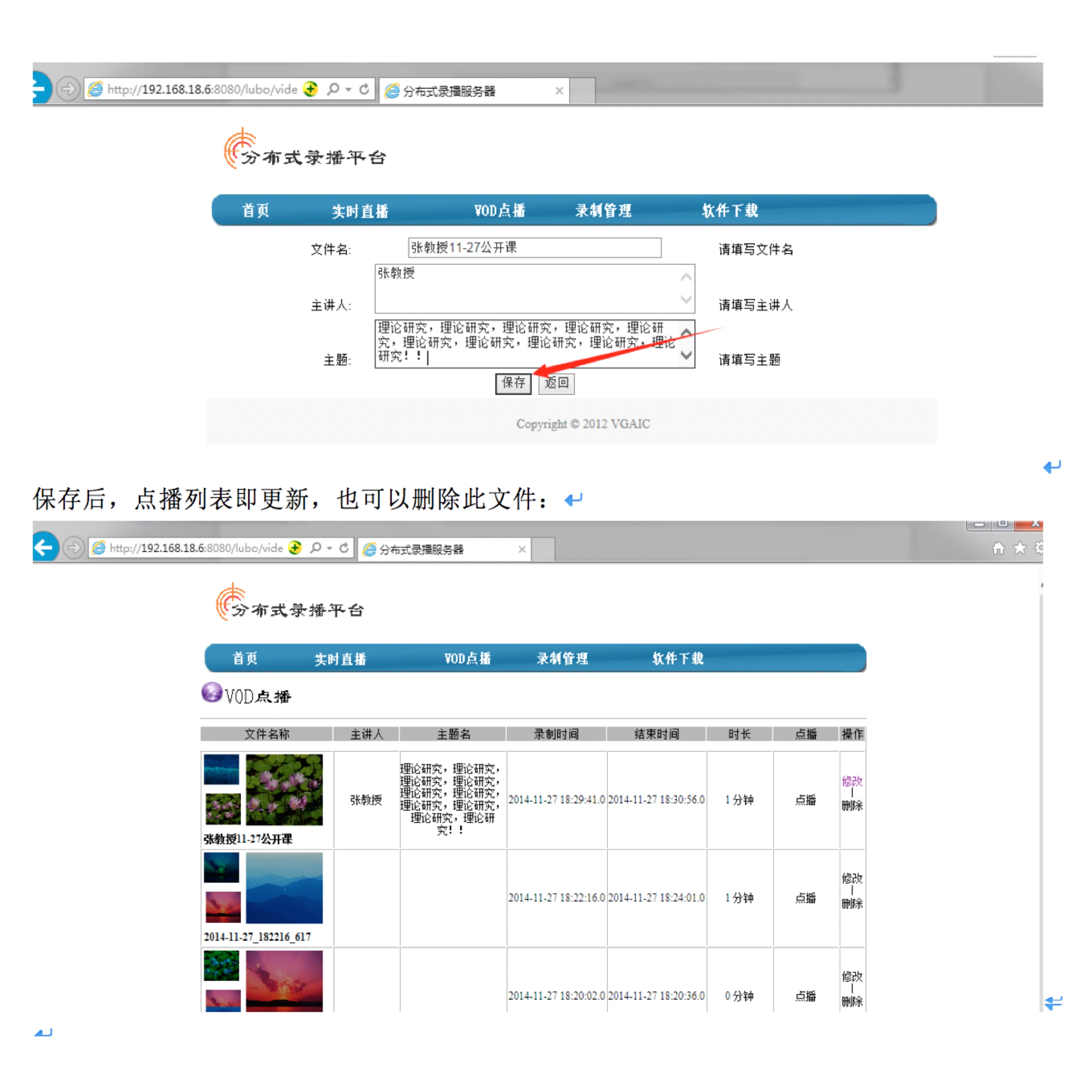 10.點(diǎn)播列表根據(jù)錄制自動(dòng)生成,可以任意修改文件名/主講人/介紹等各種參數(shù);