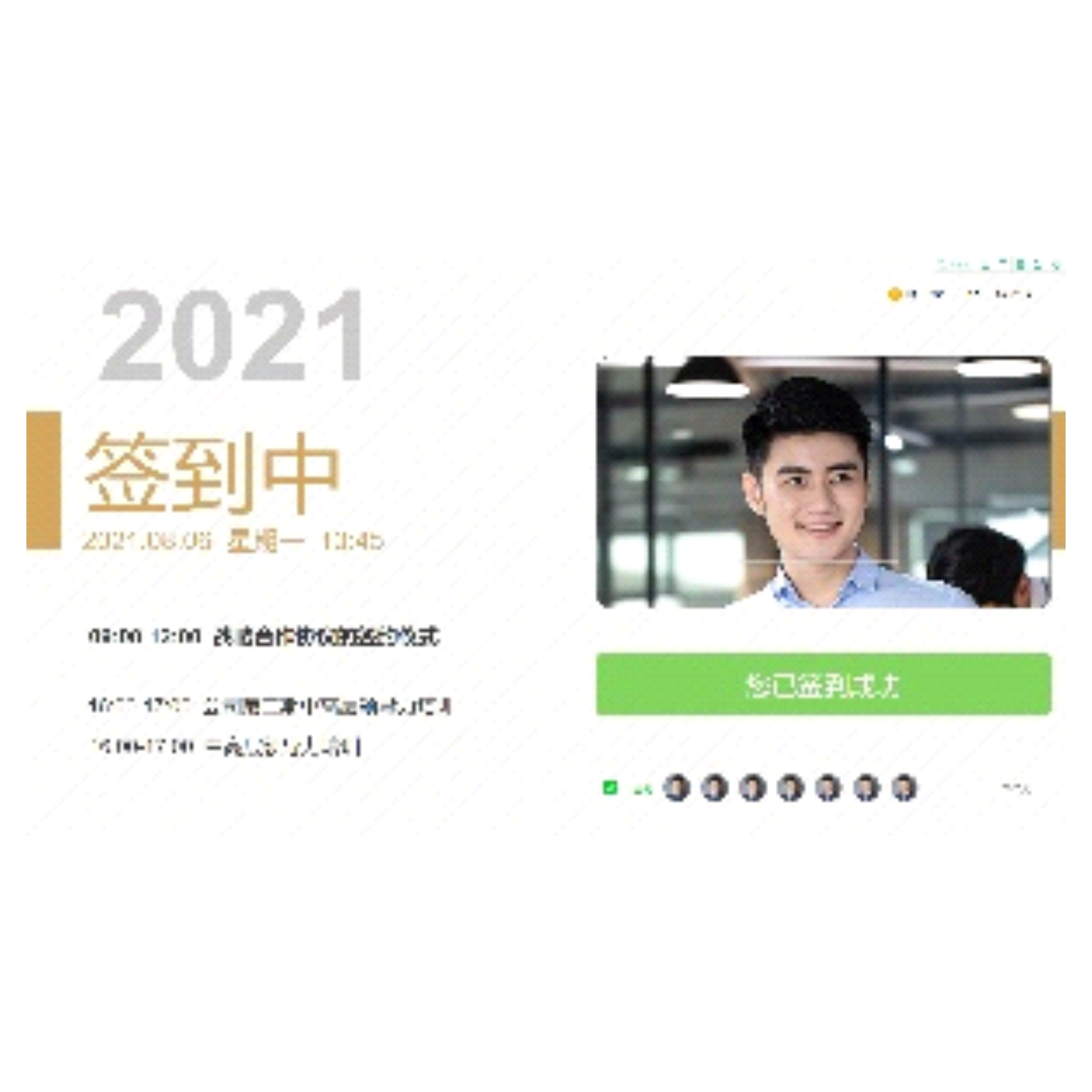 人臉識別授權 H104通過會議信息顯示屏終端攝像頭捕捉參會人員的面部照片,自動上傳至人臉識別服務系統(tǒng)。比對成功后支持參會人員的自動簽到;