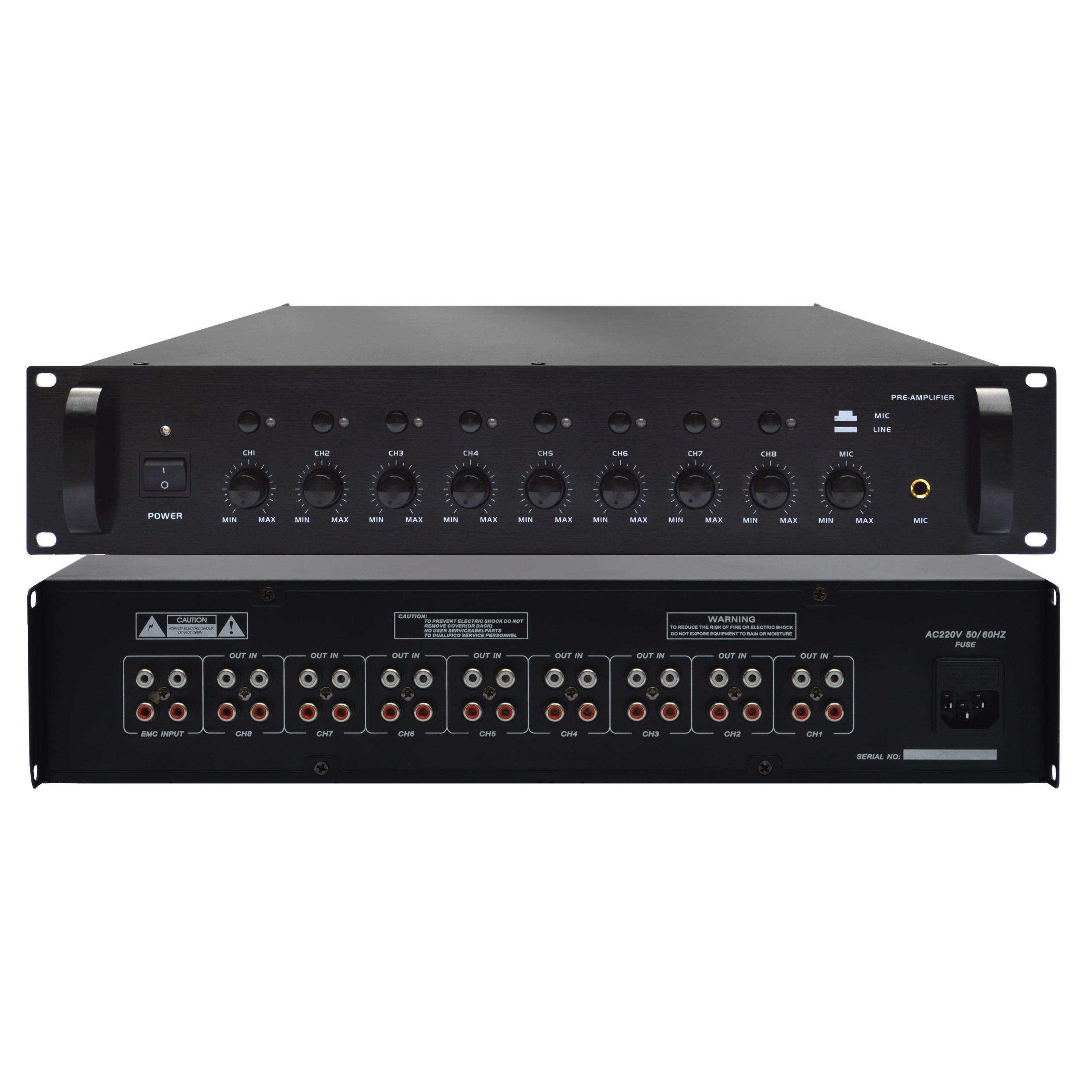1、設(shè)有8組獨(dú)立輸入,輸出放大通道,每一通道均可調(diào)校音量