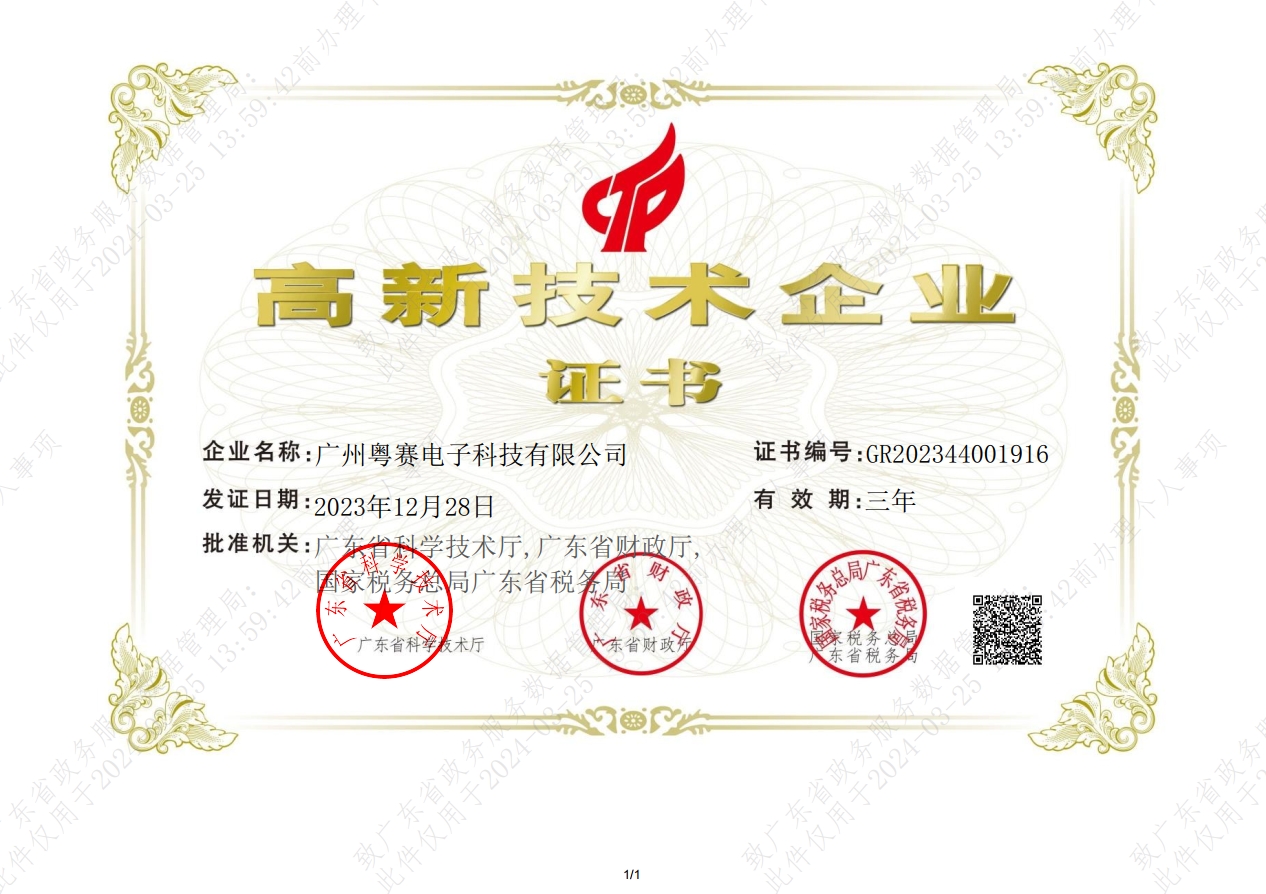 熱烈慶祝廣州粵賽電子科技有限公司通過“國家高新技術(shù)企業(yè)”認(rèn)證